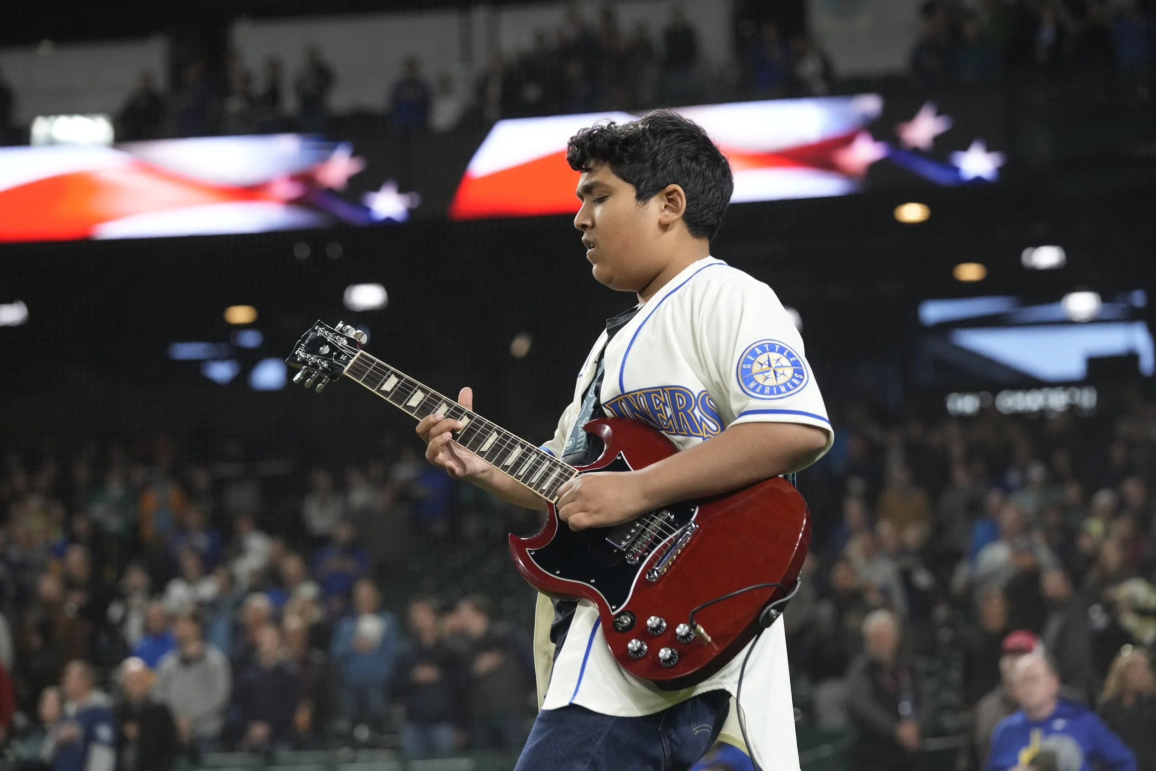 “Will Borgen told a large gaggle of reporters around him in the Mariners locker room that he thought the best part of the event’s presentation was the national anthem played by 14 year-old Nikhil Bagga amid raucous appreciations of the guitarist’s talents and range of notes played.”